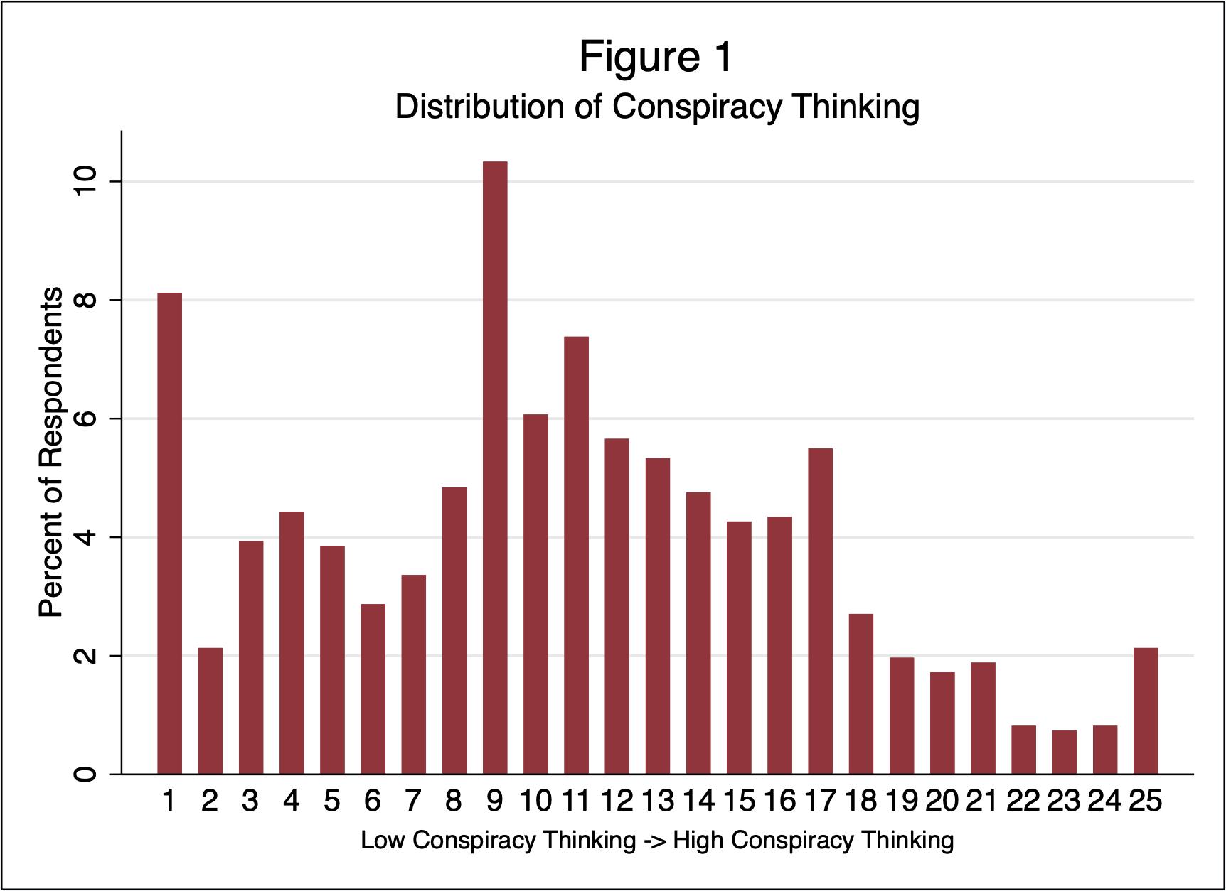 We generated a single index of conspiracy thinking by combining all of these beliefs together, the distribution of which is shown in Figure 1. Our measure is powerful, as it does not only capture adherence to specific conspiracy theories, but given the inclusion of the fictional “South Dakota crash,” it also reflects a commitment to a conspiracy mindset. Moreover, these conspiracy theories span political ideologies, which allows us to assess a general propensity for conspiracy thinking. We suggest that both Christian nationalism and biblical literalism play a role in predicting such thinking.