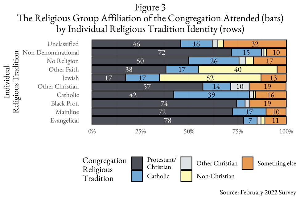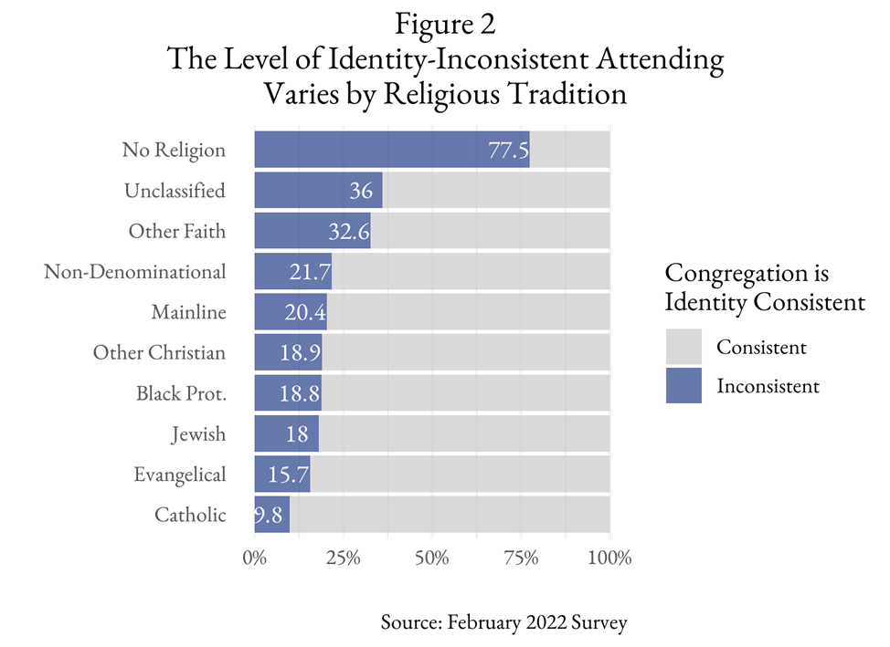 In our new research to be published open access in the Journal for the Scientific Study of Religion, we report on two recent surveys of American adults – one of 4,000 adults in February 2022 and one of 2,300 adults in March 2023, both through Qualtrics Panels. In both, after asking about their religious identity (Protestant, Catholic, Jew, Muslim, etc.), we asked “Would you say that you attend a congregation that shares the religious affiliation that you just provided?” In both surveys, after omitting the portion of the sample that does not attend any congregation, we found that about a fifth of worship-attending Americans indicated that it does not (20 percent in the 2022 survey and 18 percent in the 2023 survey). That is, twenty percent are attending a congregation that does not match their religious identity.