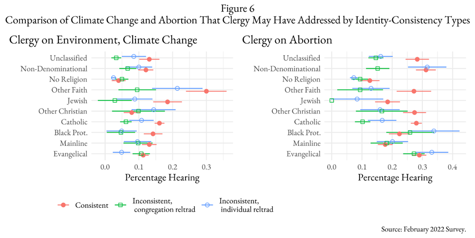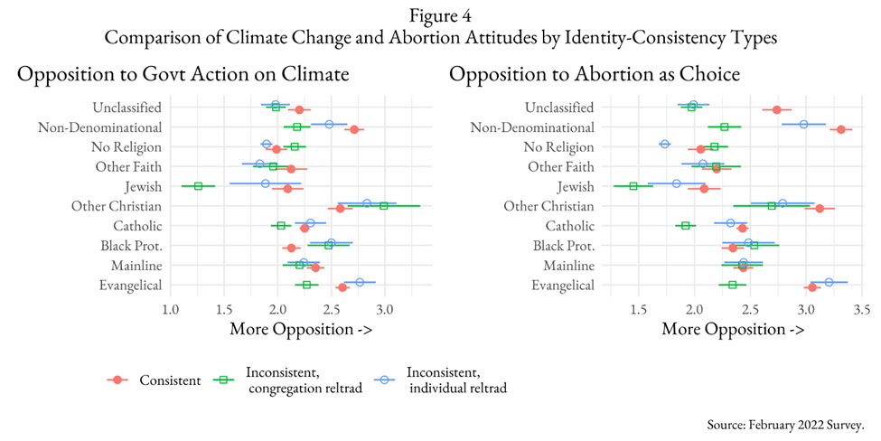 Does it matter if they attend something other than a congregation that matches their religious identity? If there is no daylight between identity-inconsistent attenders and consistent attenders, then this is all ado about nothing. But if there are gaps, then we should be concerned. In the figure below, we use attitudes on two issues – abortion and climate change – to look for gaps (we use more in the article). There are three estimates provided for each line: