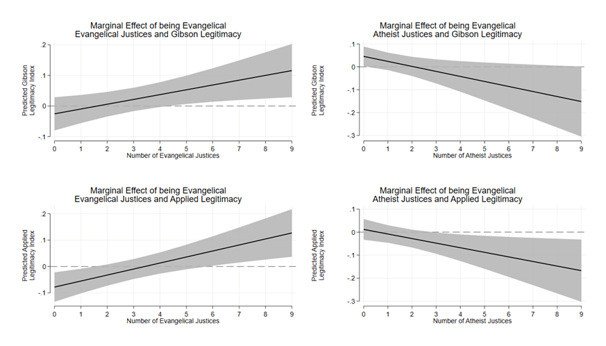 Our findings showed that when evangelicals perceived that there were more evangelical Justices, they gave the Court higher legitimacy ratings. Evangelicals gave the Court lower legitimacy ratings when they perceived that there were more atheist Justices. These patterns held even after we accounted for respondents’ partisanship, ideology, attention to the Court, and perceived ideological alignment with the Court. (The figure below shows how evangelicals (black line) react to increasing perceptions of evangelical and atheist Justices — when the black line is above the dashed line at zero, that means they see the Court as more legitimate.)