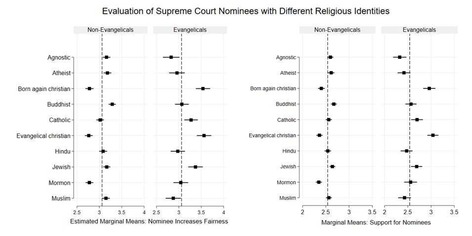 To corroborate our findings, we conducted a follow-up experiment. We surveyed 1774 respondents on Amazon.com’s Mechanical Turk; 20 percent of the respondents identified as evangelical Christians. We gave each respondent five profiles of hypothetical Supreme Court nominees. After reading each profile, respondents told us whether they would support the nominee’s confirmation to the Court, as well as whether they believed the nominee would make the Court’s decisions fairer.