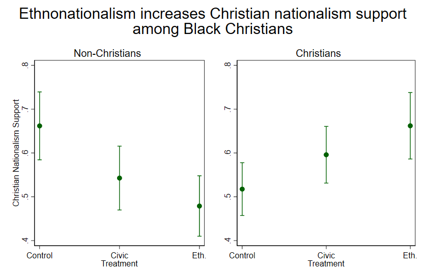 When Black Christians are exposed to civic and especially ethnonationalism, they become more supportive of Christian nationalism. Believing that the United States is a Christian nation places (Black) Christians at the center of the country. Non-Christians wouldn’t find their belonging as Americans more secure in a Christian America, but less – perceiving this overlapping exclusion, their Christian nationalism support drops.