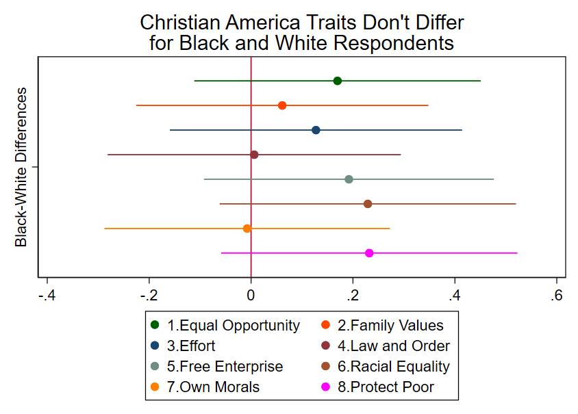 Some prior work suggests that Christian nationalism may have an entirely different meaning to Black and White Americans. If that’s the case, then perhaps Black Christians are affirming something entirely different than the hierarchical version of Christian nationalism we are more familiar with. But I also find evidence to suggest that Black and White respondents’ understandings of a Christian America aren’t all that dissimilar. On a different survey, also fielded in 2020 (N=1,530), I asked respondents how characteristic various traits were of a Christian America. The figure below is a coefficient plot showing the effects of being Black (compared to White). There are some traits Black respondents felt were more emblematic of a Christian America, including a country that protected the poor and ensured racial equality. But in every case, the difference between Black and White evaluations wasn’t statistically significant.