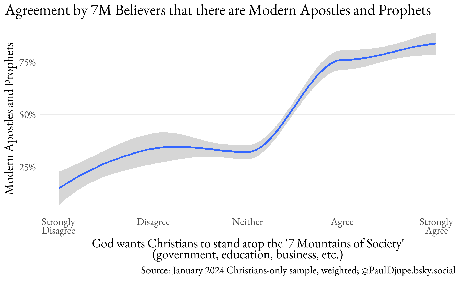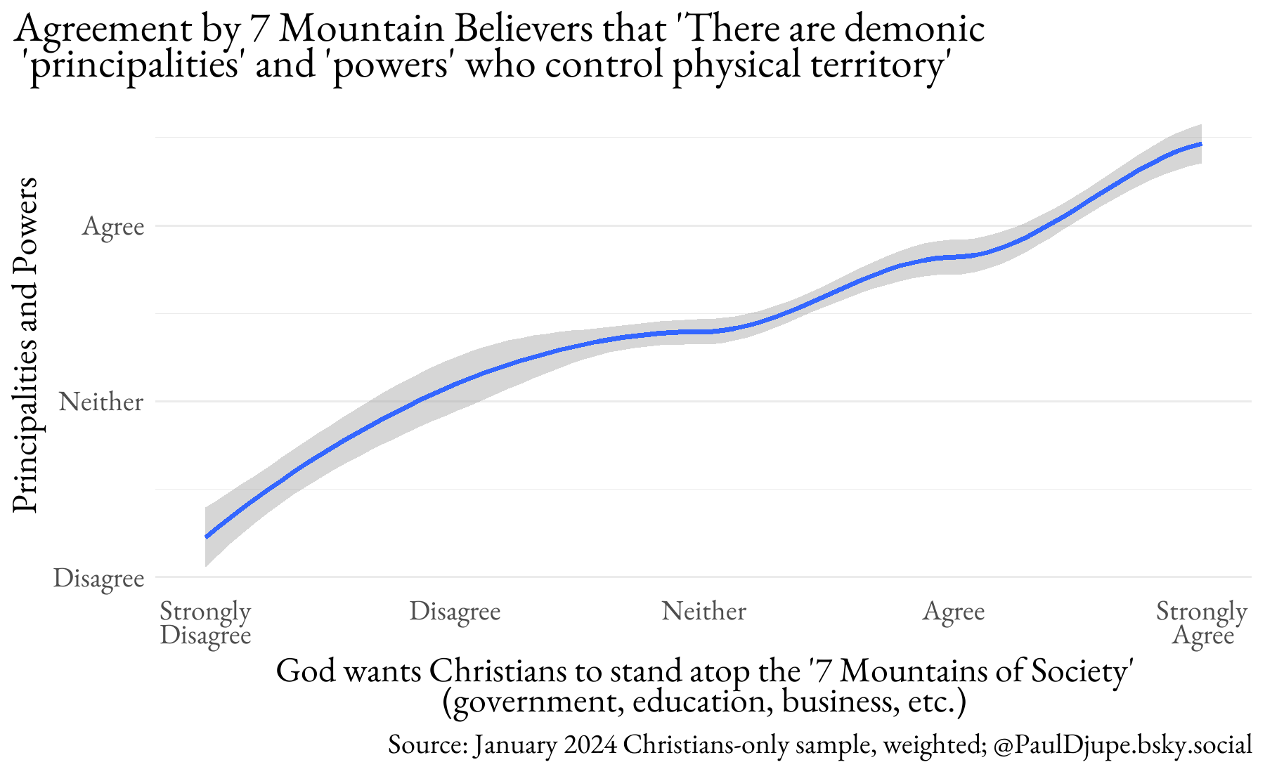 The third addresses the critique of using a set of items to capture prophecy belief. In Jenkins’ estimation, those could mean anything and therefore distinguish nothing. This is a critical test because, according to expert Matthew Taylor, the NAR popularized a cluster of ideas about apostolic/prophetic leadership, strategic spiritual warfare, and 7M-style dominion theology. And those ideas proved crucial building blocks for the core theology of Christian Trump support. Do people link the idea that there are modern apostles and prophets to perhaps the most famous prophetic meme to emerge from the NAR (7M)? The figure below shows a step change pattern so that only 7M believers show super-majority agreement with the idea that “There are modern-day apostles and prophets, and they should be integral to church leadership today.”