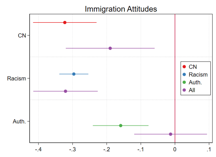 Then I turned to a GSS question about whether the US should let in more immigrants. Higher values show more support for increasing immigration quotas. By themselves, we might conclude that Christian nationalism and authoritarianism are strong predictors of opposition to immigration. But again, the effects shift once relevant covariates are added to the model. Once racial resentment is introduced (again, the purple dots and whiskers), the effect of Christian nationalism and authoritarianism diminish. This isn’t to say that Christian nationalism itself doesn’t matter when it comes to immigration–it’s clearly still negative and significant–but that some of Christian nationalism’s explanatory power is actually derived from its correlation with racial resentment.