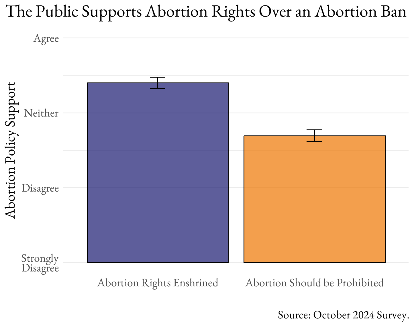In October 2024, we fielded an experiment about abortion rights. Half of the nationally-representative sample was randomly assigned to a statement about abortion: either “Abortion should be prohibited by a Constitutional Amendment” or “The right to an abortion should be enshrined in a Constitutional Amendment”. Respondents then indicated, on a five-point scale, how strongly they agreed or disagreed with the statement.