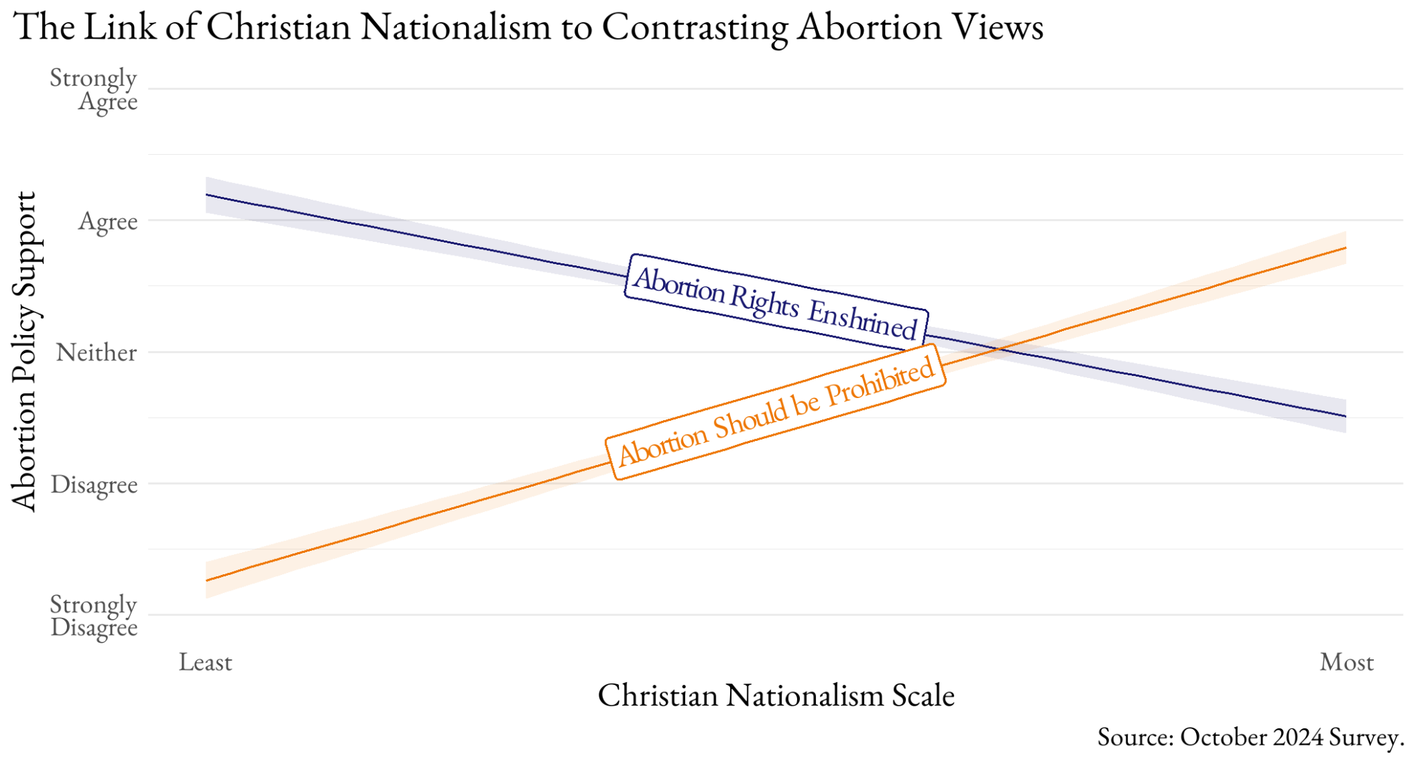 The most interesting part of the story, though, features the opponents to Christian nationalism (left side of the figure). Their support for an amendment to protect abortion rights falls somewhere between ‘Agree’ and ‘Strongly Agree’, and their opposition to a ban on abortion is very near ‘Strongly disagree’.
