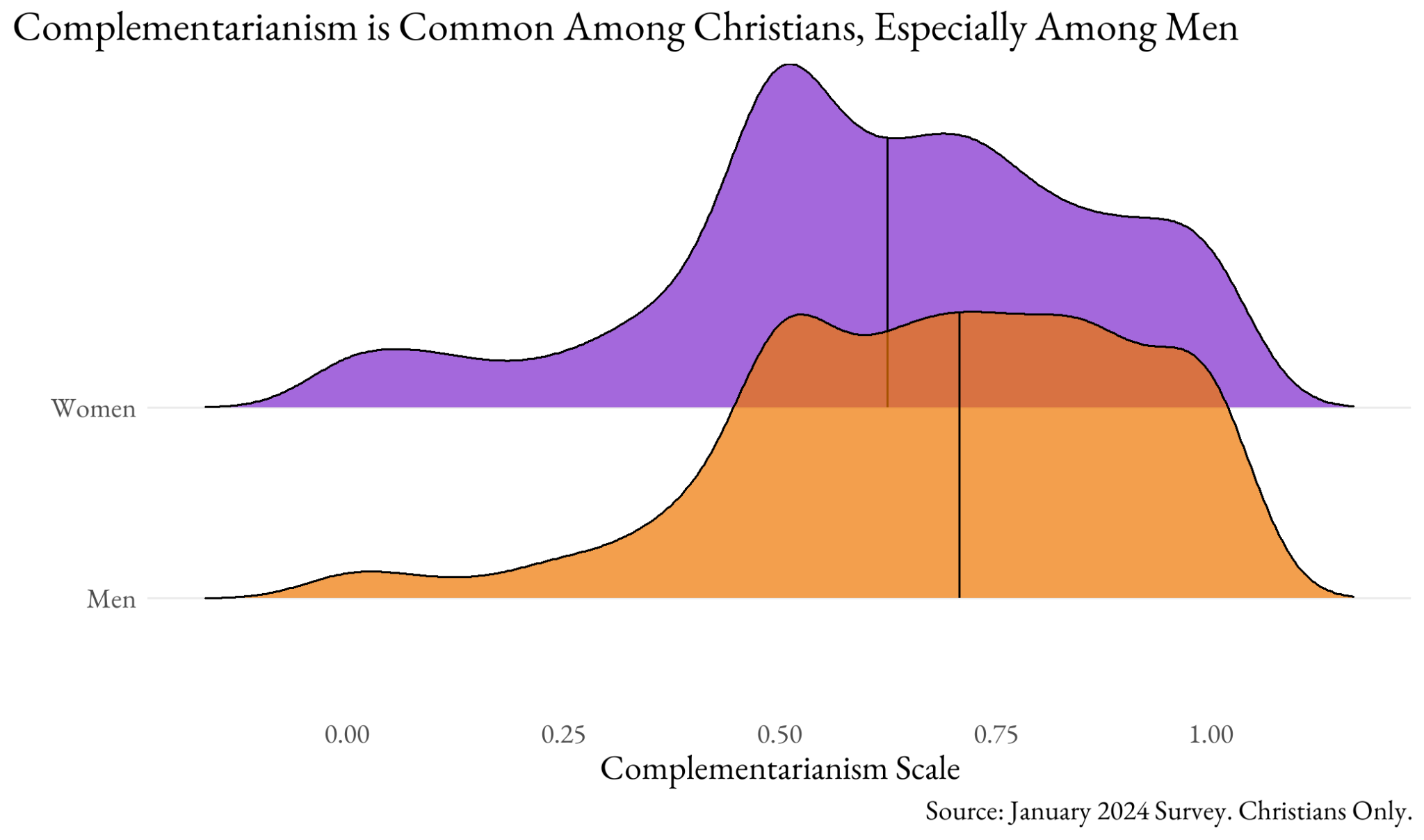 In this case, we are near perfectly equipped to start this investigation. In January 2024, and funded by a Jack Shand grant from the SSSR, we surveyed nearly 1,500 Christian identifiers on the Lucid/Cint online platform, using quotas so that respondents look like the population of adult Christians in the US. We are just beginning a larger project on a particular Christian gender ideology that resonates with some of the (scant) theological material covered in the story. Complementarianism is a set of ideas that suggests men and women were made for each other, playing complementary but separate roles. Men are designed (by God) for leadership, public life, fighting, and protecting. Women, on the other hand, are for caring, raising children, and private life. We composed six items that capture many of the major facets of complementarianism from the Council on Biblical Manhood and Womanhood, which developed perhaps the most full-throated articulation of complementarianism in the Danvers Statement in 1987: