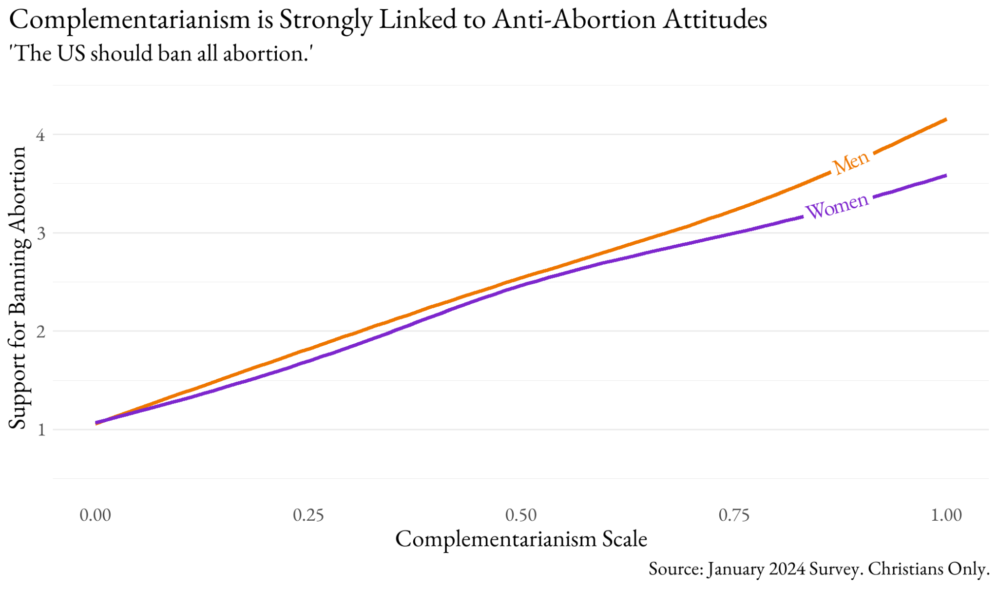 Now to the heart of the matter. Our measure of complementarianism is strongly linked to a belief that the US should ban all abortion (see the figure below). Those Christians who reject this gender ideology also strongly reject the idea of an abortion ban (score of 1 on the y axis). Greater acceptance of complementary roles for men and women also show greater support for an abortion ban. And that rate is monotonic – it increases steadily until full acceptance of complementarianism is linked to support for an abortion ban (a 4, which is not quite “strong support” which is a 5 on this scale). It is notable that a small gender gap opens up at the top of the complementarianism scale with men slightly more in favor of an abortion ban. That relationship between complementarianism and banning abortion is a simple, bivariate one, but this strong relationship holds in a more complex statistical model that we will explore in future work.