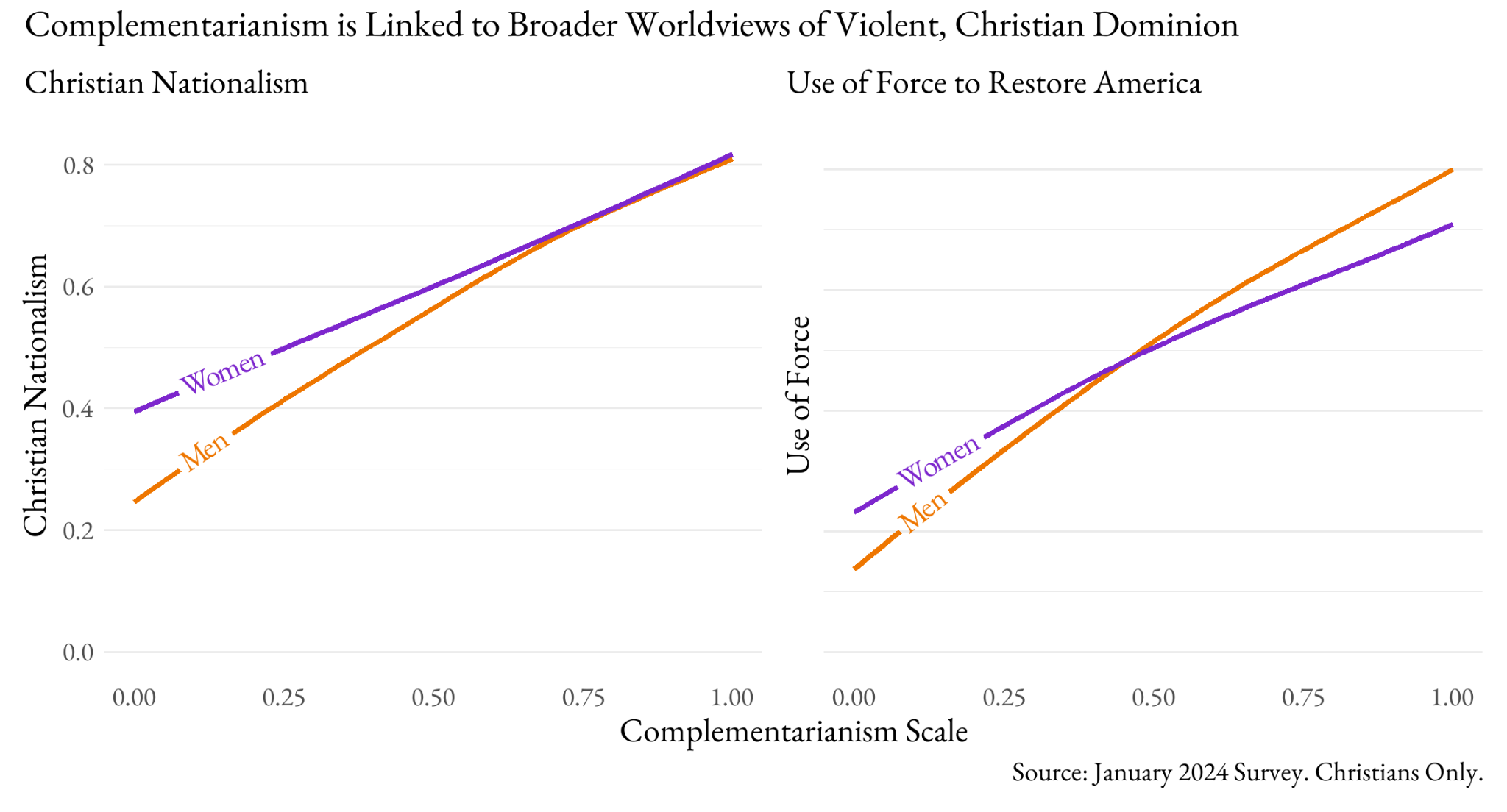 In our January 2024 data, complementarianism is strongly related to Christian nationalism as well as the need for the use of force to take America back, as the following figure shows. The relationships do not differ much between men and women – Christian women have more default Christian nationalism and have somewhat lower support for violence at the highest levels of complementarianism, which is predicted by the worldview, of course (it might have been a greater gap if the question had segmented what kind of person could use force rather than just the generic use of force).