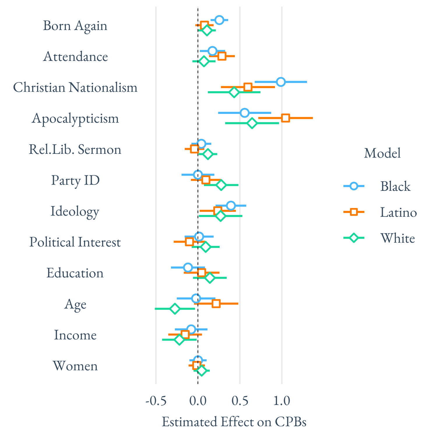 But maybe different types of people from each racial group are drawn to CPBs. We predicted CPBs for Whites, Blacks, and Latinos separately – Figure 1 below shows how the predictors of CPBs compare by racial group. There are relatively few differences between racial groups. For instance, older whites believe in more extensive CPBs, while age has no effect on Blacks or Latinos’ views. It is important to note that worldviews like Christian nationalism and apocalypticism are connected with CPBs for White, Black, and Latino respondents at roughly equivalent rates. And CPBs are connected to greater conservatism for all three racial groups.