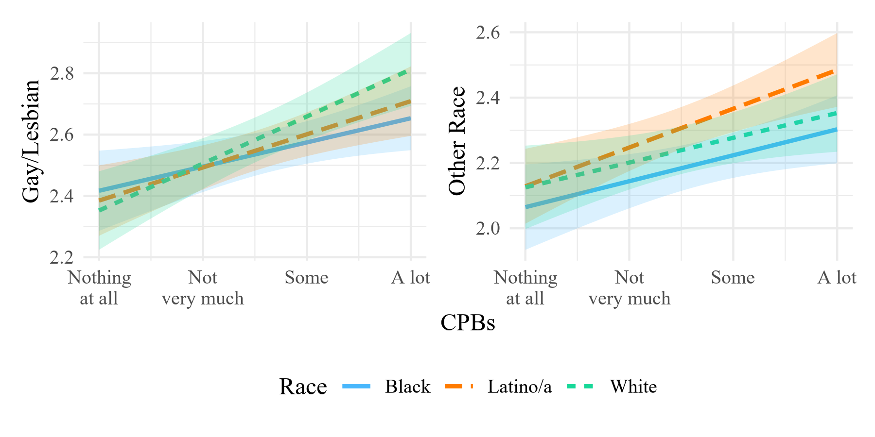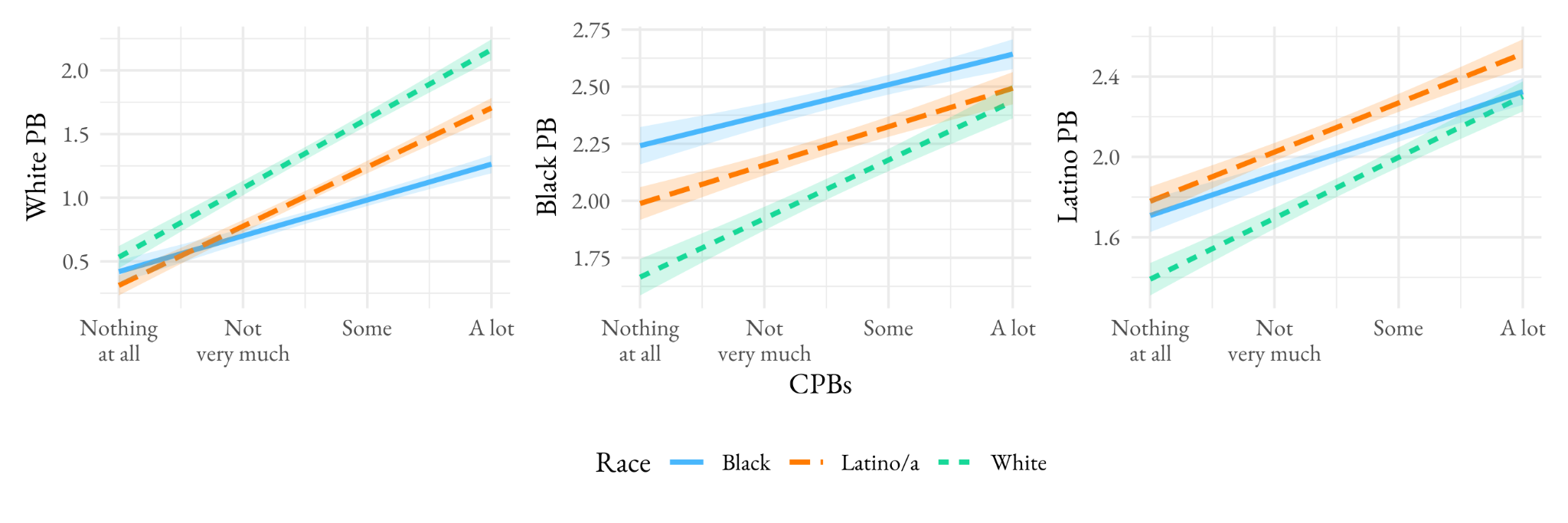 Perhaps CPBs are segmented from views of how racial groups are treated. Given these data, we are able to compare Christian persecution beliefs to discrimination perceptions of each of our three racial groups: White, Black, and Latino (the lines show beliefs of respondents from each racial group while the panels show beliefs about persecution of each racial group — for example, the green line in the first panel shows how more extensive CPBs among Whites are linked to perceptions of racial bias toward Whites). If CPBs are about White advocacy, we should see positive correlations between CPBs and perceptions of anti-White discrimination, but not of anti-Black or anti-Latino discrimination. But our data tells a different story (see Figure 2 below). CPBs are positively correlated with racial group discrimination perceptions, and this is true for all three racial groups.
