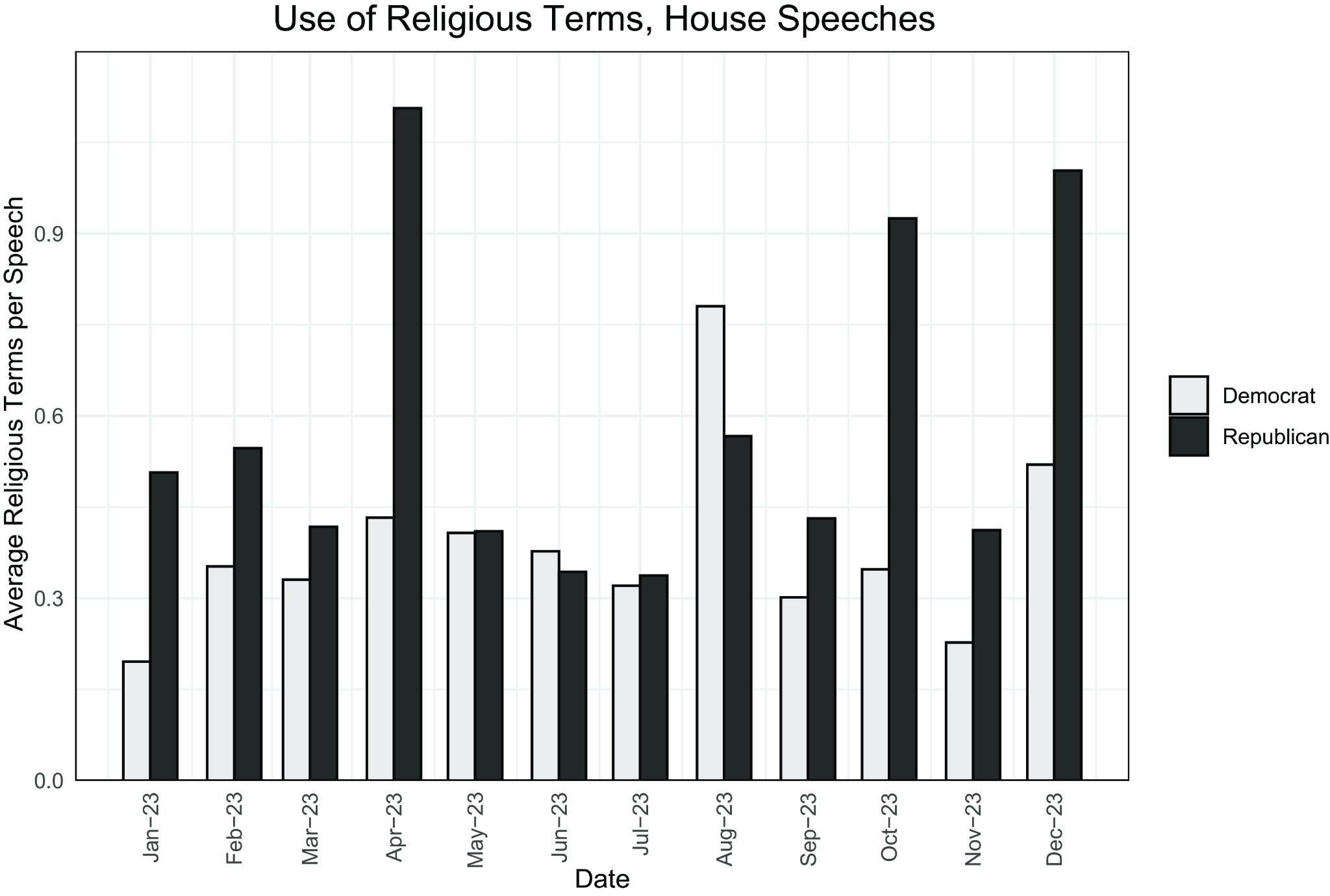 We aimed to answer this question by analyzing a substantial amount of congressional communication: nearly 10,000 official speeches delivered on the House floor and around 9,000 e-newsletters sent by representatives directly to their constituents. Our analysis focuses on two months before Speaker Johnson’s election in October 2023 and two months afterwards, allowing us to compare the “before” and “after”. We anticipated that Republican representatives would increase their use of religious language after Johnson became Speaker, more so than their Democratic counterparts.