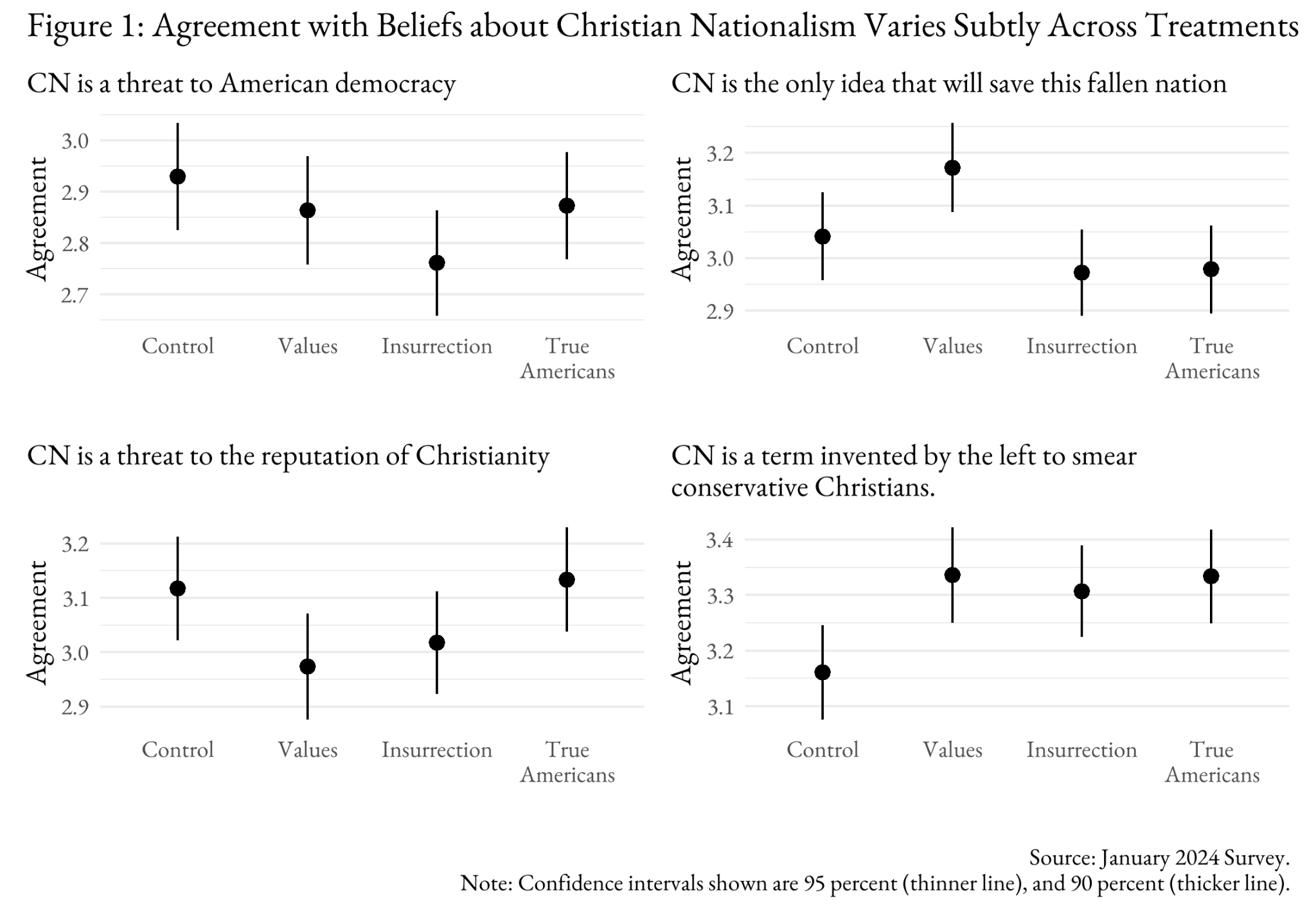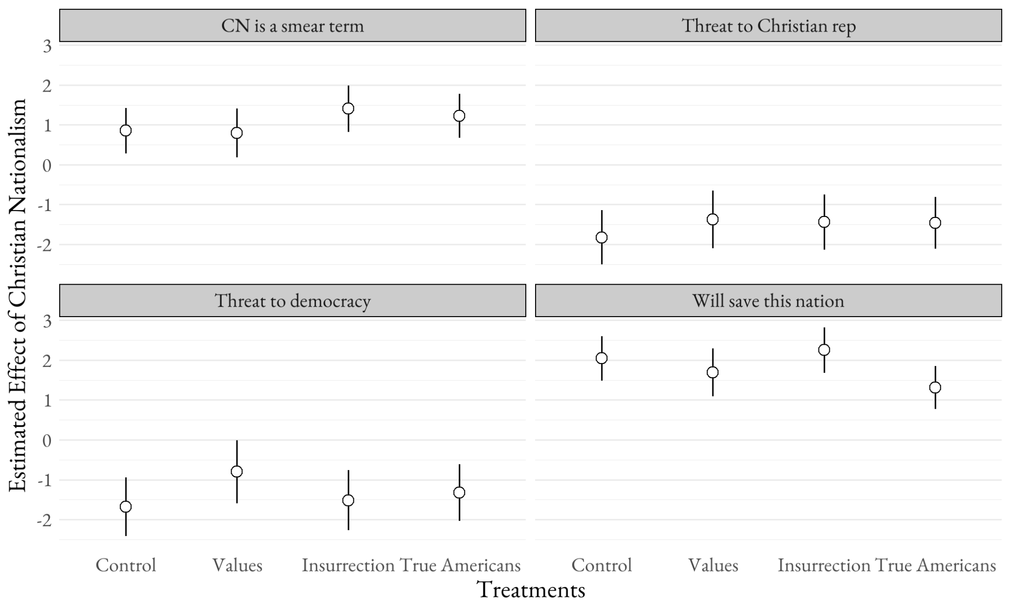 Figure 2 – The Treatments Do Not Significantly Alter the Effects of Christian Nationalism on the Four Beliefs about Christian Nationalism